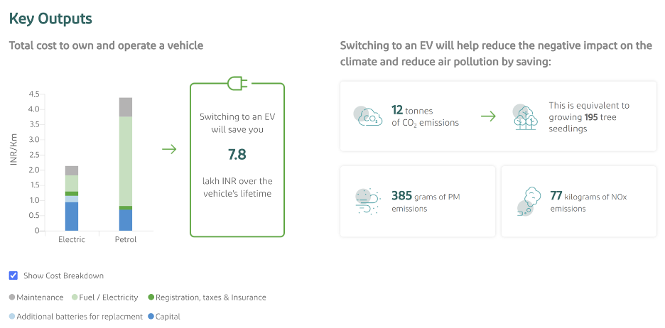 For example, an electric three-wheeler delivery vehicle running 100 km a day in the state of Maharashtra has a TCO of 2.2 INR/km, compared with 4.4 INR/km for a petrol three-wheeler, saving the owner around 7.8 lakh INR over the vehicle’s lifetime. The interactive graph can help the user understand more about each cost component. In addition to cost benefits, the visualization also shows how switching to EVs can help reduce 12 tonnes of CO2 emissions, 77 kg of NOx emissions, and 385 grams of PM emissions. The easy-to-use dashboard along with rich details related to cost and environmental benefits helps fleet operators and end-users with better decision-making around their vehicle purchase.